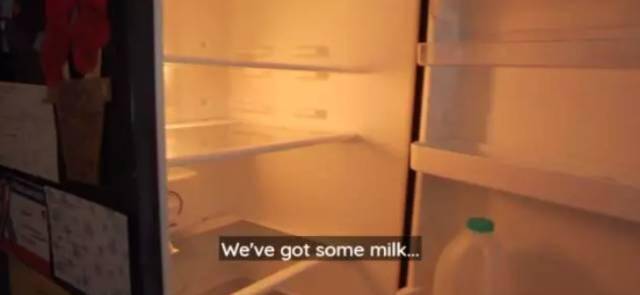 打开冰箱,更是苦笑不止。除了一点牛奶和薯条,空无一物。