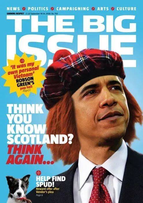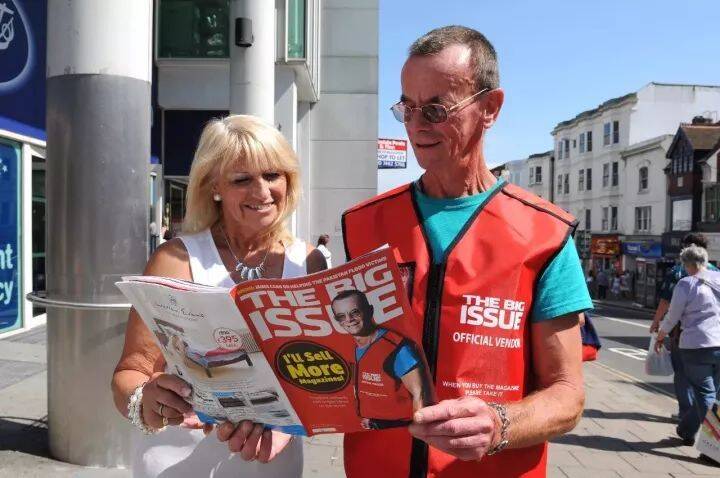 The Big Issue是一份公益性杂志, 由美体小铺的创始人高登·罗迪克创办, 它通过流浪汉进行贩售,每卖出一份, 流浪者可以得到一半收入。