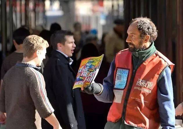 白天,他就在街上, 对着衣着光鲜的人群,大声吆喝着: “The Big Issue, ladies and gentlemen!”