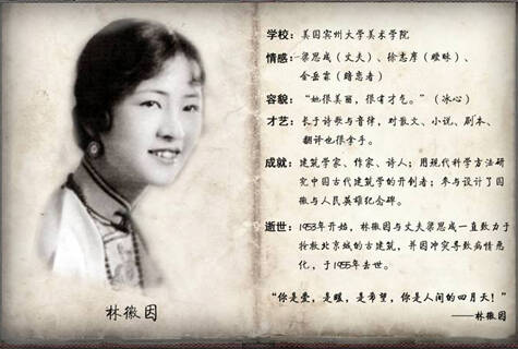 对于那个年代的中国女性 能以这样的方式书写墓碑 是绝无仅有的 可林徽因却用她短暂的一生 让自己当之无愧