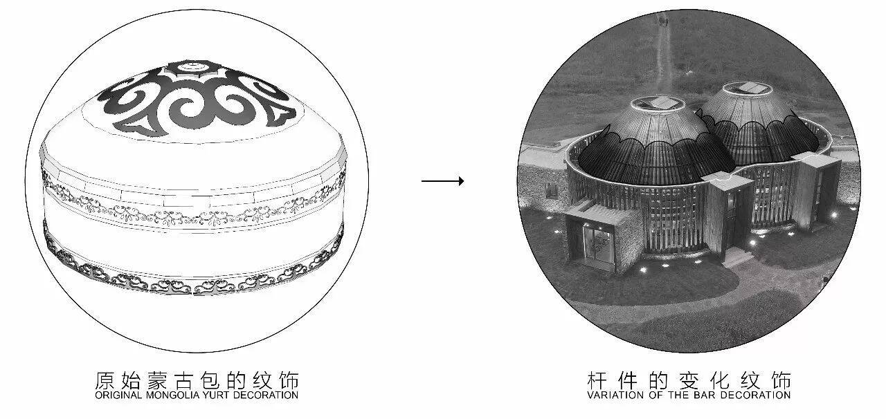 在立面装饰上,吴彦祖利用,蒙古包的纹饰特点,通过粗细不同的木杆组合,创造出充满韵味的花瓣纹样。