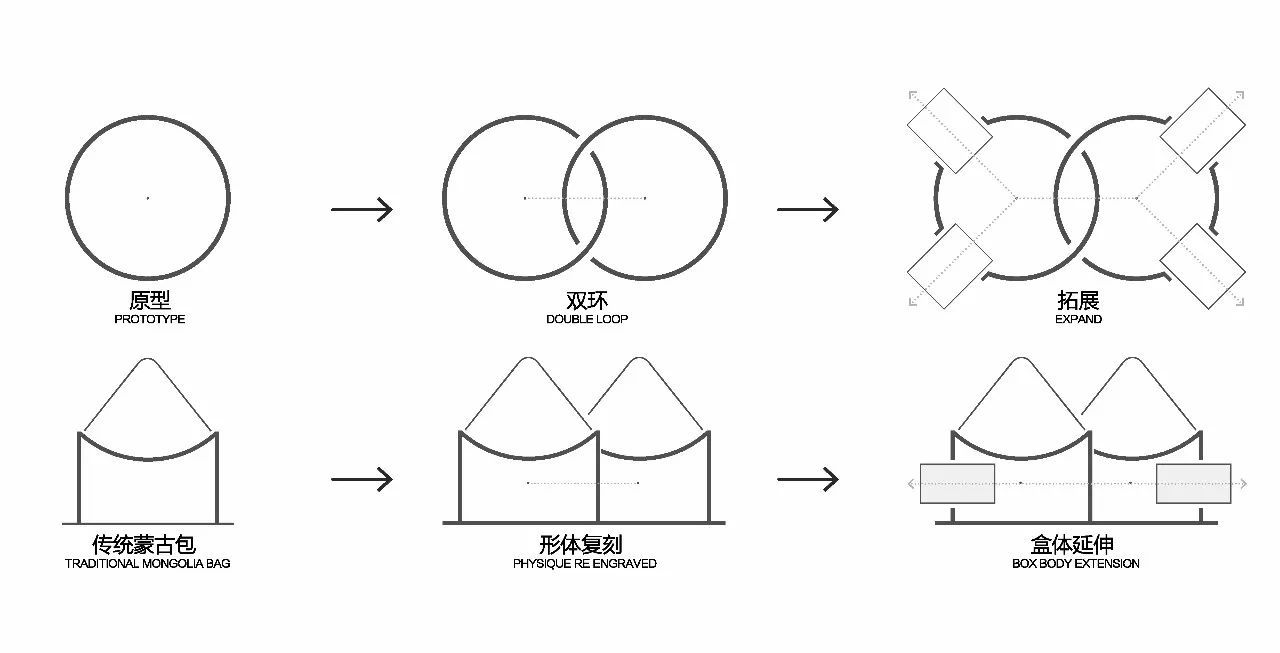 双环圆在中国传统文化里,代表吉祥如意,于是,同行的张海翱建议,将蒙古包的造型,做成两个相交的圆,用现代手法演绎传统精神。