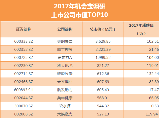 在2017年机会宝组织调研(或独家调研)的上市公司中,美的集团市值超过3629亿元领跑,顺丰控股和京东方A分列二三位,科大讯飞、牧原股份、天齐锂业等市值也超过了500亿。10只股票年内平均涨幅超7成。
