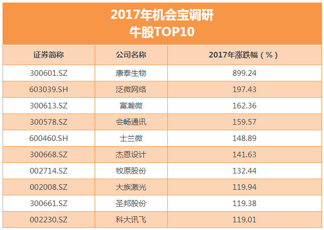 2017年,机会宝组织调研(或独家调研)了逾200家上市公司,包括美的集团、顺丰控股、京东方A、科大讯飞、天齐锂业、牧原股份等多家行业龙头。在所有调研的上市公司中,2017年股票上涨的占比近6成,17只股票涨幅翻番,占比9.14%。其中,泰康生物今年累计上涨近9倍。