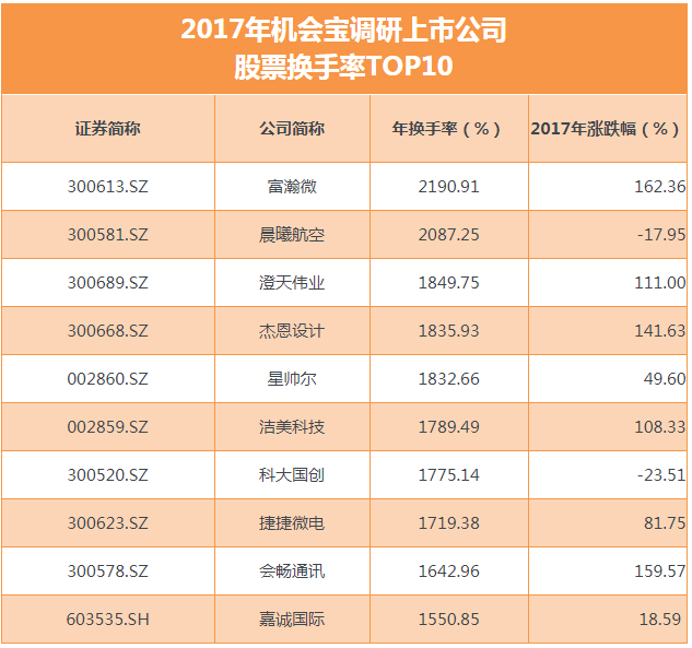 从2017年机会宝调研上市公司股票换手率TOP10中不难看出,次新股依然换手率凶猛,共有8家次新股占据前十宝座(科大国创和晨曦航空除外)。富瀚微全年换手率均超过21倍,居于首位,其次为晨曦航空和澄天伟业。