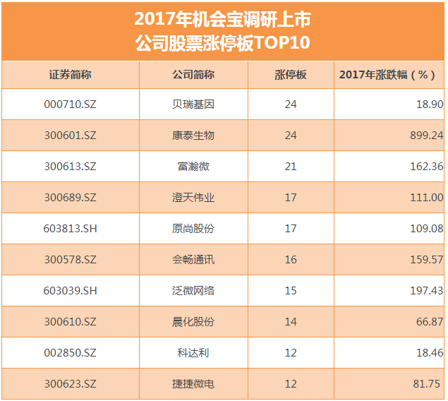 2017年机会宝组织调研(或独家调研)的上市公司中,次新股成为当之无愧的涨停王,涨停榜前十占据九席(贝瑞基因除外),10只股票平均17个涨停,年内平均涨幅182.47%。泰康生物和贝瑞基因以24个涨停板名列第一。