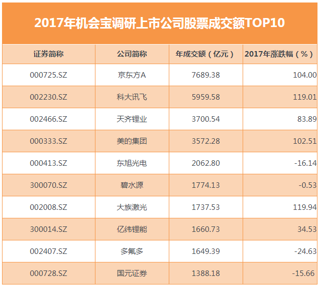 2017年机会宝组织调研(或独家调研)的上市公司中,京东方A 2017年累计成交额突破7689亿元,居于首位,其次是科大讯飞,成交额近6000亿元。成交额最高的10只股票年内平均涨幅达到50.69%。