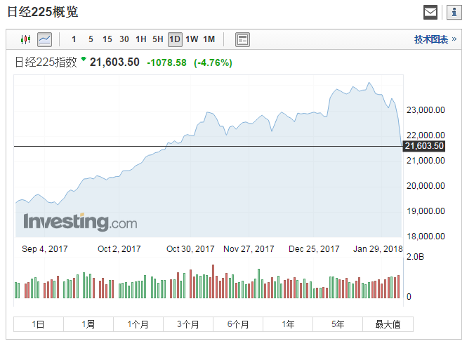 凤凰国际iMarkets讯 受美股暴跌影响,日经225指数周二收盘下跌4.7%,报21610.24点;从1月23日高点暴跌10%,进入回调区间;日本东证股价指数周二收盘下跌4.4%,报1743.41点。由于通胀忧虑导致美国股市周一(2月5日)创下六年半来最大的单体跌幅,亚洲股市周二(2月6日)上午全面下挫,其中日本股市一度重挫近7%,领跌亚股。与此同时,香港恒生指数下跌近5%,创下2016年以来最大单日跌幅,上证综指日内亦下跌超过2%。
