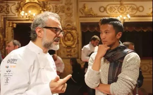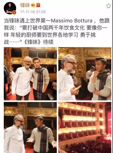 而在超级网综《锋味》刚刚播出的意大利站中,谢霆锋在歌剧院再次与米其林相遇——他甚至带着朝圣的热情、迷弟一般的与“世界第一厨师”、米其林三星餐厅Osteria Francescana的缔造者Massimo Bottura交谈、合影,并拿到了一句令他激动的赠言——“要打破中国两千年饮食文化,年轻的厨师应该去往世界各地学习,勇于挑战。”